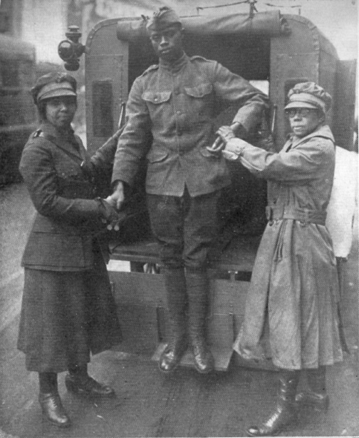 101. Motor Corps Women did much for the comfort of sick and wounded during the war and after. Two are here shown doing their bit in helping a wounded hero from ambulance into a theatre where a show was given for wounded Colored soldiers.
