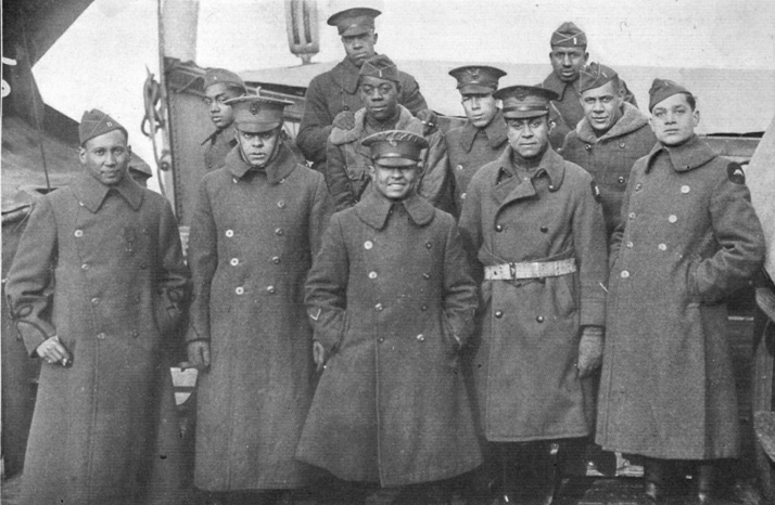 112. Another Group of officers of the 370th (Old 8th Illinois) on the deck of the La France before landing. Reading left to right: 2nd Lt. Lawson Price; 2nd Lt. L. W. Stearls; 2nd Lt. Ed. White; 2nd Lt. Eli F. E. Williams; ist Lt. Oasola Browning; Capt. Louis B. Johnson; 1st Lt. Frank Bates; 1st Lt. Binga Desmond.