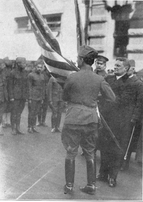 122. Presenting the Colors to "The Buffaloes." Governor Charles S. Whitman presenting, on behalf of the New York Union League Club, the National and Regimental Flags to the 367th nfantry, just before they started overseas.