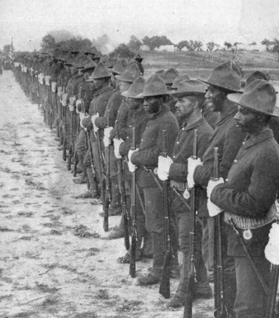 123. American Negro Soldiers in the Spanish-American War. For more.than a half century the Negro soldier has played an important part in the Army of the United States. This photograph, taken during the Spanish-American War, shows how our colored troops who fought in 1898 were uniformed and equipped.