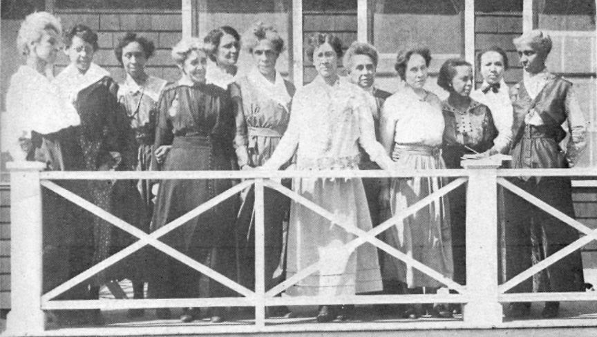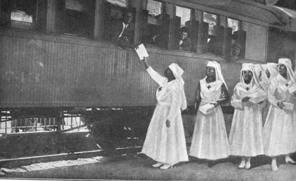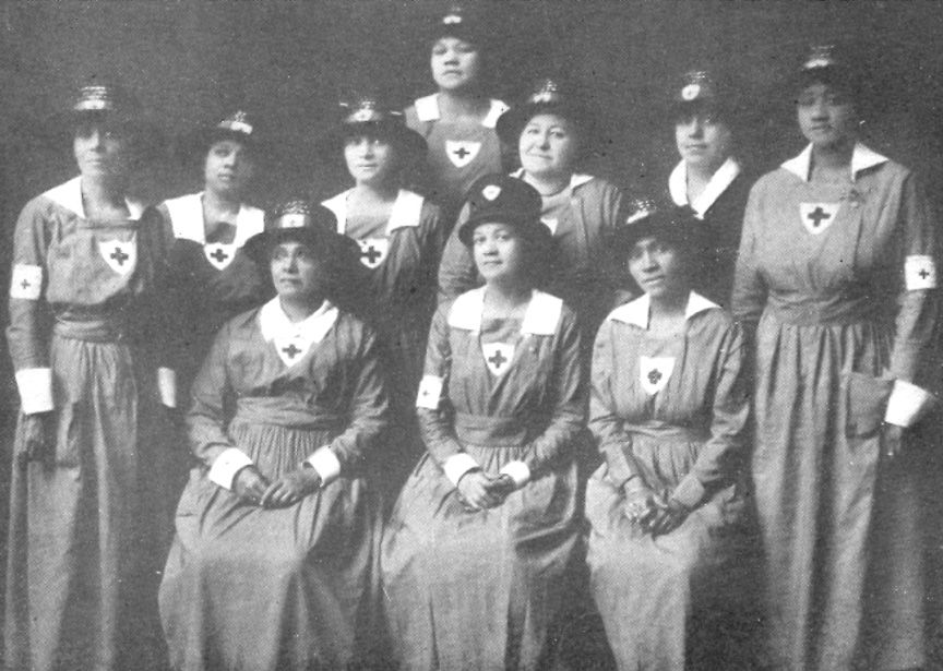 130. Colored American Red Cross Canteen War Workers who canteened all Colored soldier troop trains passing through Chicago to and from the front. First Row Left to Right---Mrs. Eva Jenifer, Captain Dr. Mary Fitzbutler Waring, Mrs. DeWitt Smith. Second Row Left to Right---Lieut. Hattie Oldham, Mrs. Sadie Anderson, Mrs. Helen Thorne,. Mrs. Juanita Hawlins, Mrs. Mary Wickliffe, Mrs. Lillian Gully, Lieut. Mayme Haddox.
