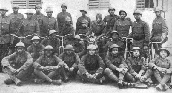 134. Colored messengers of Motorcycle Corps, 372nd Headquarters, who kept communication lines alive at all hours during the big drive in Champagne, Argonne and at Verdun.