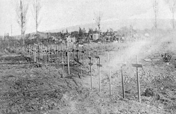 136. Burial place of the 92nd Division near a roadside leading out of Pont-à-Mousson to Metz. Here are laid to rest those who fell in the operations against Metz and those who died of sickness during that period.