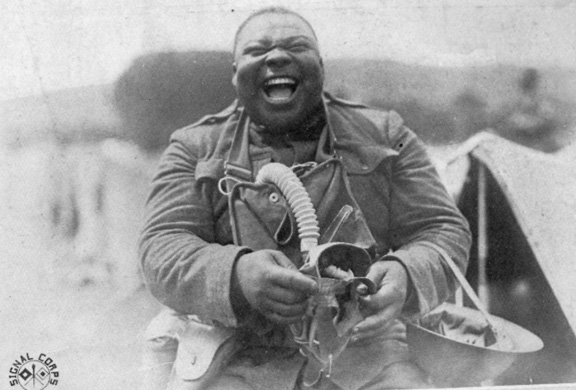140. "Big Nims" of the 3rd Battalion , 366th Infantry, who found great amusement in contemplating the grotesque appearance of his comrade with a gas mask adjusted over his face and head. Many hours of gloom was dispelled by the good humor of Nims which together with his unquestionable courage at many times served to cheer the flagging spirits of his comrades.