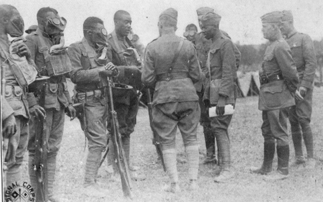 141. Group of Negro Soldiers behind the lines being instructed in approved methods of using gas masks before going forward to the trenches.