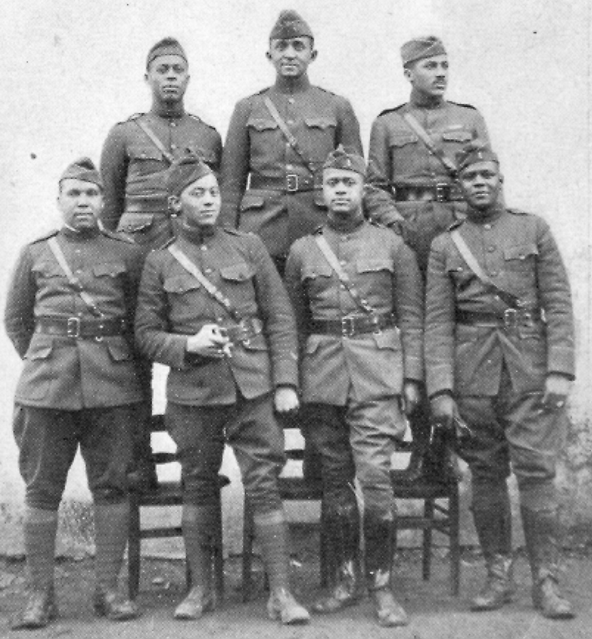 133. Group of Officers. Top: Left to Right---1st Lt. Ewell W. Clarke, Asst. Personnel Adjutant Hdq. Staff, 92nd Div.; 1st Lt. Almardo Henderson, 367th Inf.; 1st Lt. F. S. Upshur, 350th F.A.; Center: Left to Right---2nd Lt. R. D. Hardeway,367th Inf.; Capt. Aaron Day, Jr., 317th Am. Tr.; 2nd Lt. A.M. Watson, 350th Mchn. Gun Bat. Below: Left to Right---2nd Lt. Scott A. Moyer, 349th F. A.; 2nd Lt. Win. F. Grady, 368th Inf., and 2nd Lt. Walter W. Scott, 368th Inf., who was gassed at the Argonne Forest in an attack on Binarville.