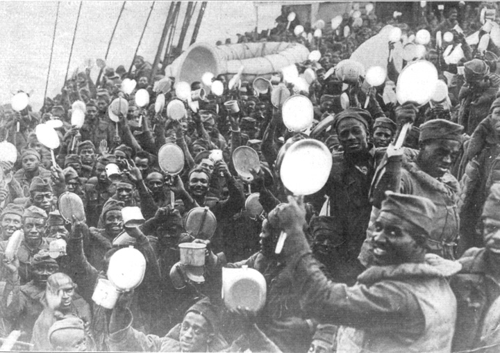 147. American Negro troops returning from their gallant service in France. The above photograph was taken at mealtime aboard a United States Transport just entering New York Harbor. The demonstration would signify that the men were ready for the mess hall.