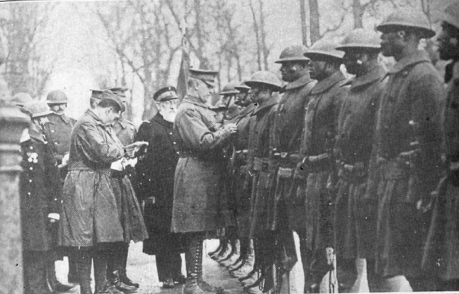 148. Colored American Soldiers being decorated with Distinguish Service Cross by Major-General Eli Helmick of the United States Army in the presence of Admiral Moreau of the French Navy.