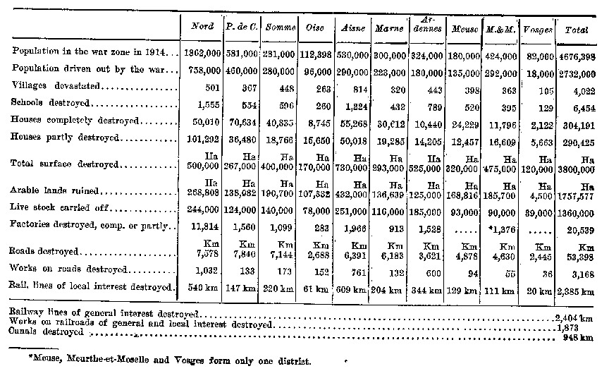 Inhabitants driven from their homes 2,732,000 Lands destroyed by battle 3,800,000 Hect. Villages devastated 4,022 Houses completely or partly destroyed 594,616 Schools destroyed 6,454 Factories destroyed (completely or partly) 20,539 Live stock carried off 1,360,000 head Railway lines of general and local interest destroyed 4,789 km. Roads destroyed 53,398 km. Canals destroyed 948 km. Public works destroyed on roads and railroads 5,041 Pre-War production of the devastated zone w